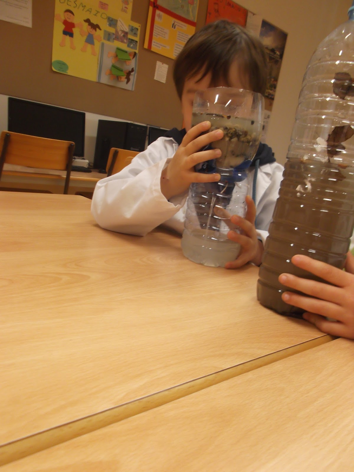 Iniciou-se a experiência misturando na água materiais diversos (pedaços de madeira e papel, folhas secas, tinta e terra). Mostrou-se às crianças a água suja e perguntou-se: “Como podemos tornar esta água mais limpa?” Cada grupo levantou hipóteses que foram registadas. O passo seguinte consistiu em construir o filtro caseiro. Cortaram-se as garrafas a meio e colocou-se a parte do gargalo virado para baixo na outra metade da garrafa, como um funil. Colocou-se tecido a tapar o gargalo e atou-se com fio para que ficasse bem seguro. Posteriormente, colocou-se uma camada de algodão dentro do funil, depois uma de carvão em pó, areia e por fim as pedrinhas. De seguida, perguntou-se às crianças: “De que cor acham que a água se vai tornar?”, registando-se as respetivas respostas. Foi realizada a experiência vertendo a água suja para dentro do filtro e observando o que acontecia. No final, foram discutidos os resultados observados colocando a questão: “De que cor é que ficou a água depois de ser filtrada?”. As crianças responderem que a água tornou-se mais clara e mantiveram o interesse e entusiasmo durante toda a experiencia.