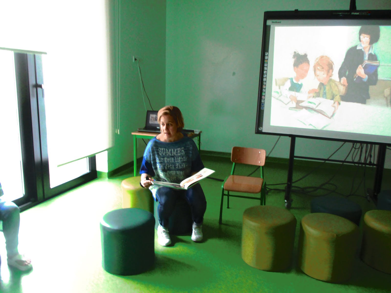 A professora Ana Júlia veio à biblioteca contar-nos a história "Madeline Finn e o cão da bibblioteca".É uma história muito bonita que nos ensina a não termos medo de nos enganar quando não soubermos as coisas e também nunca desistir, tentar sempre, mesmo sendo muito devagar, termos um amigo que nos ajuda quando precisamos faz muito bem!
