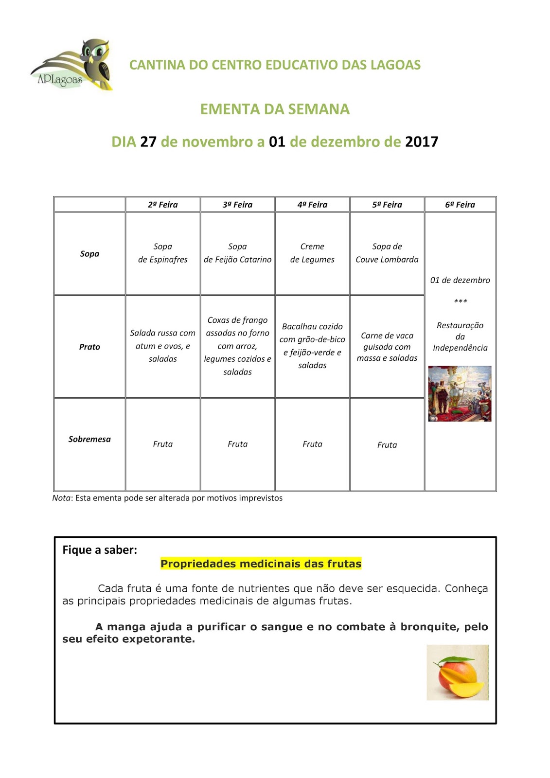 Cantina da Escola - Ementa da semana - de 27 de novembro a 1 de dezembro